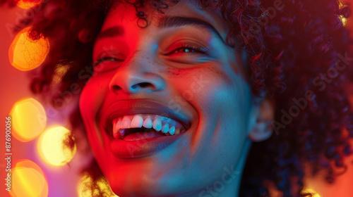 Candid joyful portrait of a young woman with curly hair and colorful bokeh lights