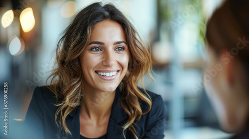 Smiling businesswoman in a professional setting having a conversation