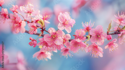 Close-up of delicate cherry blossom branches in full bloom against a soft blue sky