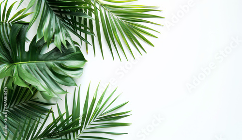 Vibrant green palm leaves arranged in an elegant flat lay on a white background