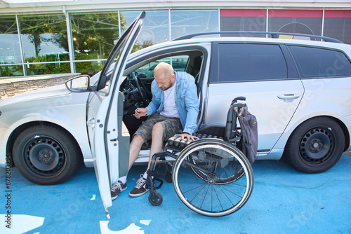 Man with a disability transfers from car to wheelchair, showcasing independence and accessibility