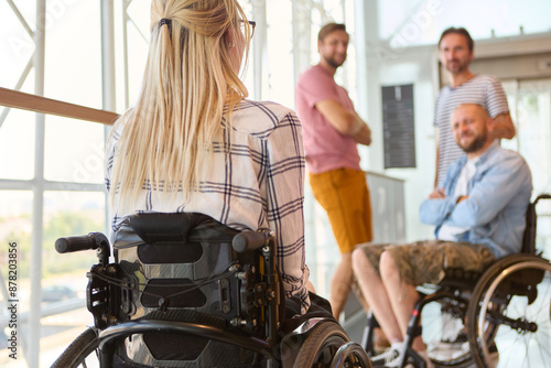 Group of friends engaging with a cheerful person using a wheelchair in a bright modern building