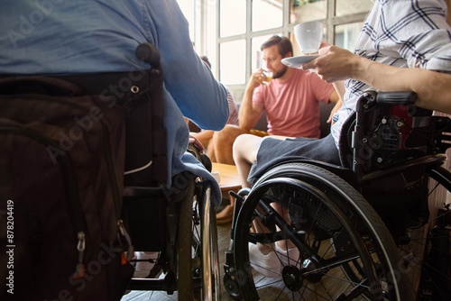 Social inclusion at a cafe: Person in wheelchair enjoying coffee with friends