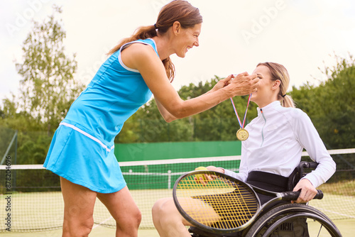 Inclusive friends celebrating on a tennis court, person in a wheelchair with medals