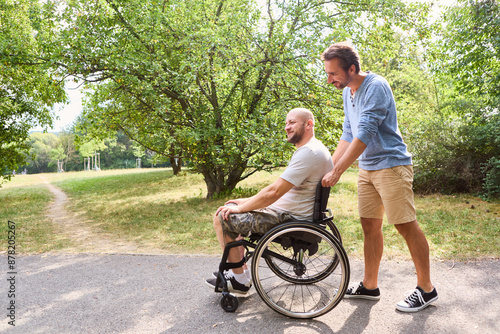 Smiling man using a wheelchair enjoying a day at the park with a friend