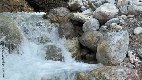 Powerful White Water River Flowing Through the Rocky Austrian Alps in Summer.