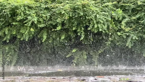 Heavy rain falling in puddles on sidewalk before row of bushes