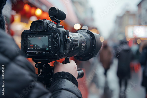 Close-up of a hand operating a professional camera in busy urban setting