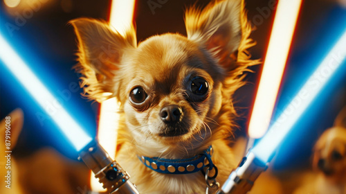 Adorable Chihuahua with blue lightsabers in futuristic setting