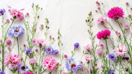 Pink and purple cornflowers on white background, vibrant floral arrangement