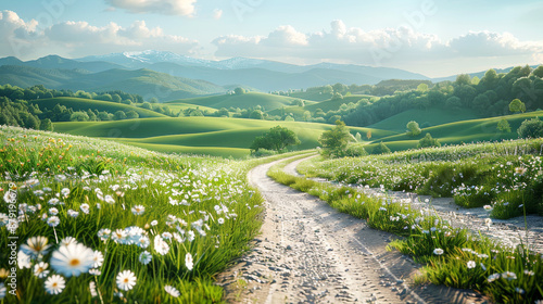 Peaceful countryside road with blooming flowers and rolling hills