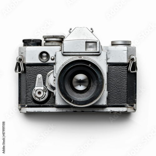 Vintage camera and film rolls on rustic wooden table with warm sunlight