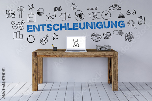 Schriftzug Entschleunigung über Schreibtisch mit Icons
