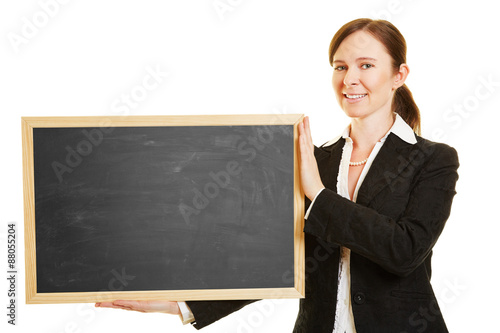 Lehrerin hält leere Tafel in der Hand