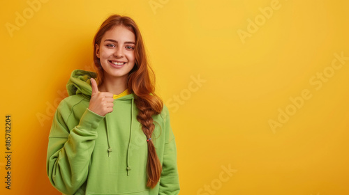 Full length photo of cheerful woman in green hoodie giving thumbs up on yellow background