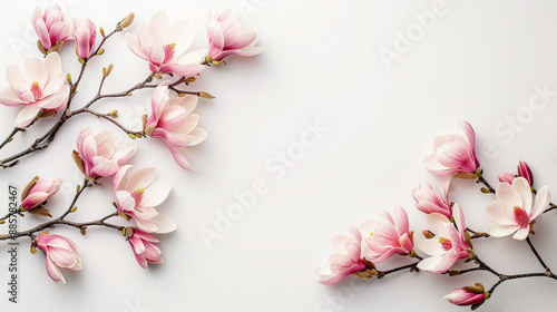 Beautiful pink magnolia flowers on branches set against a pristine white background