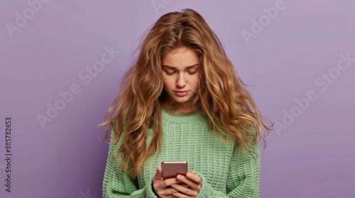 Young woman with wavy hair looks at her smartphone with a worried expression
