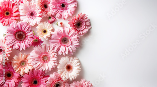 Pink chrysanthemums on left side over white background creating a serene and elegant floral arrangement.