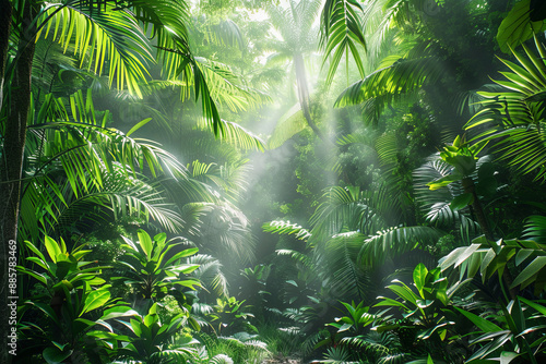Lush tropical rainforest with vibrant green vegetation and sun rays