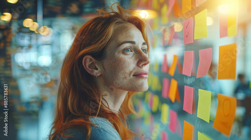 Young woman brainstorming creative ideas on sticky notes in modern office