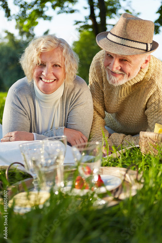 Paar Senioren macht Picknick im Garten