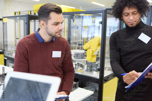 Team of engineers discussing robotics programming and automation in a modern tech lab