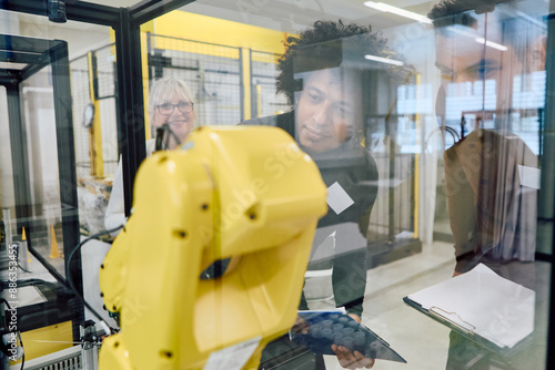 Engineers collaborating and programming robotic arm for industrial automation