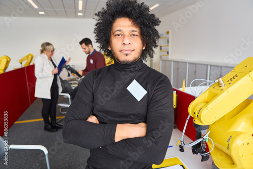 Engineer at robotics lab developing and programming multipurpose robotic arms for industrial automation