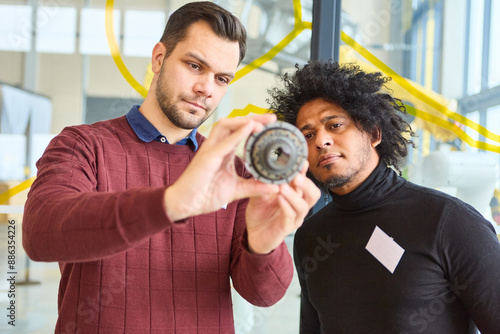 Engineers discussing robotics component in modern laboratory setting for industrial automation