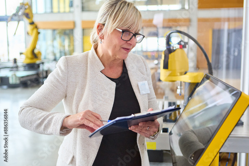 Woman adjusting glasses while observing robotics training and programming in industry setting