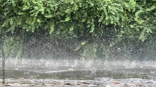 Heavy rain falling in puddles on sidewalk before row of bushes