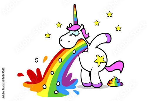 Rosa Cartoon Einhorn beim Kotzen und Kacken von Regenbogen