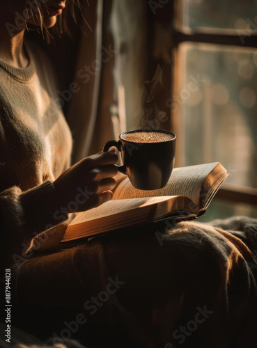 Close-up of person reading a book with a cup of coffee by a window in cozy light