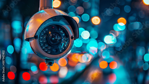 Close-up of CCTV camera with colorful night city lights in background for security monitoring