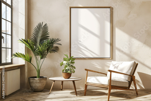 Minimal interior design mockup with blank frame, plant, and cozy armchair