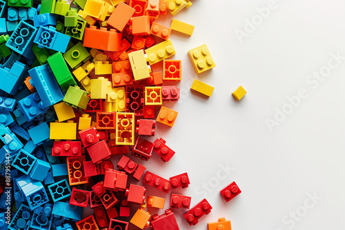 Colorful bricks scattered on a white background for creative play and construction