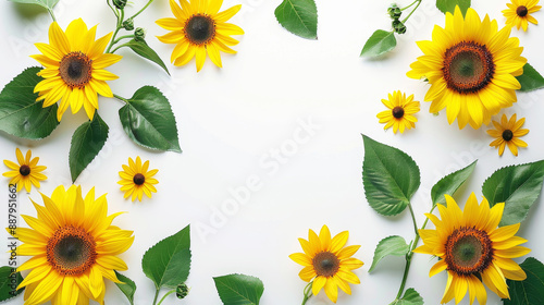 Beautiful yellow sunflowers arranged on a white background with green leaves