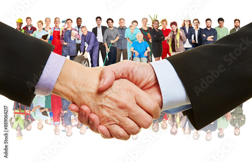 Handschlag vor Menschen vieler Berufsgruppen als Personal Konzept