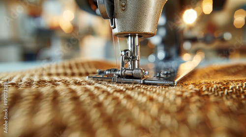 Close-up of a sewing machine foot stitching fabric with motion blur