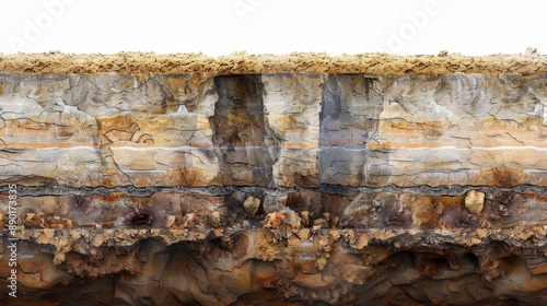 Cross section of soil revealing underground layers and textures with different soil compositions and colors