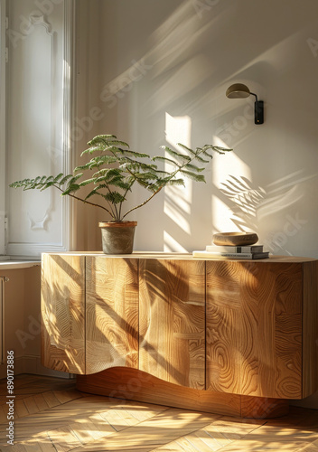 Minimalist Japanese-style interior with wooden bench and natural decor elements
