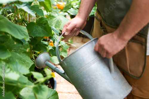 Man holding watering can in greenhouse filled with lush green plants on a sunny day