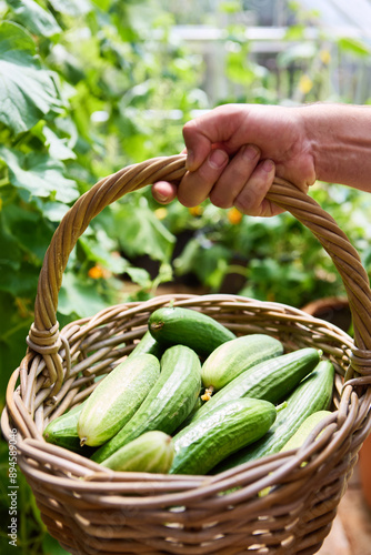 Freshly harvested cucumbers in white crate held by gardener wearing striped shirt in vegetable garden