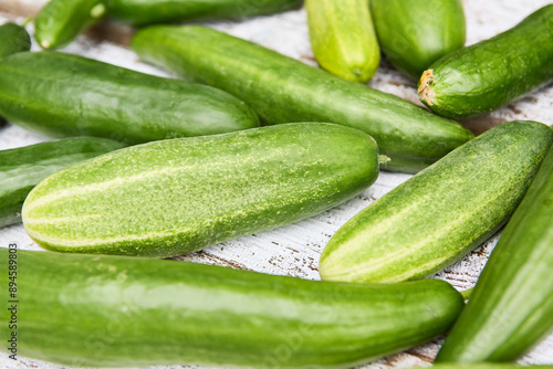 Fresh green cucumbers on rustic wooden background showcasing organic summer harvest