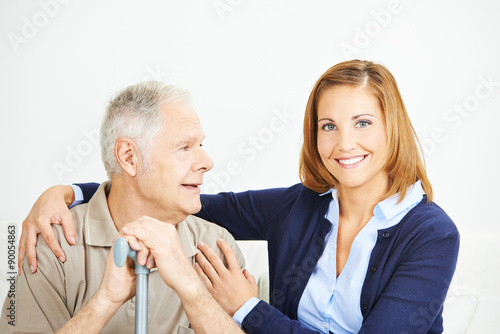 Lächelnde Frau umarmt Senior im Seniorenheim