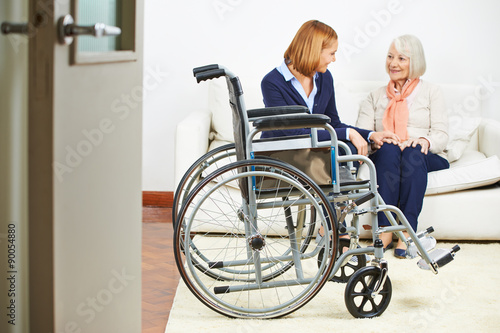 Seniorin mit Querschnittlähmung im Rollstuhl am Fenster