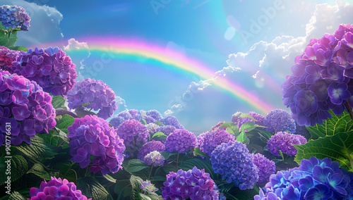 Beautiful rainbow shining in the blue sky over a field of purple hydrangeas