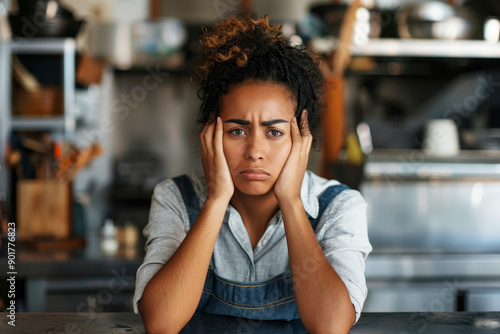 Frustrated woman in restaurant kitchen wearing apron, feeling distressed
