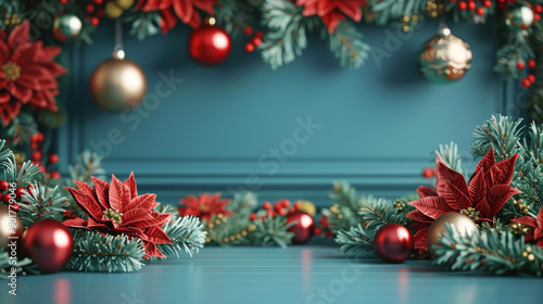 Merry Christmas and New Year's decorative frame with baubles and poinsettias