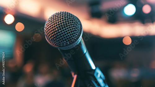 Microphone on stage with blurred auditorium crowd, spotlight in background